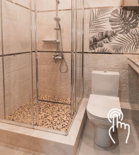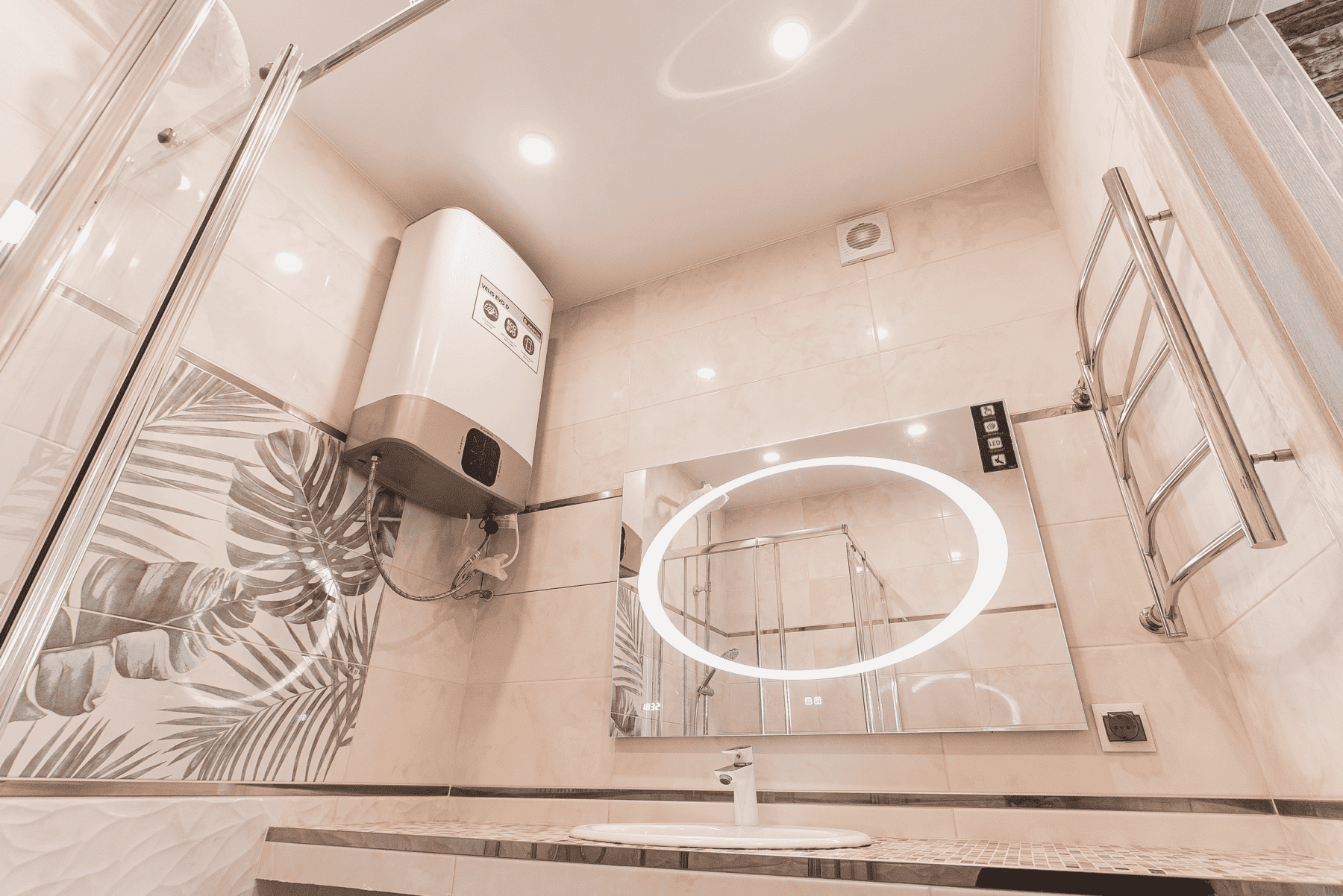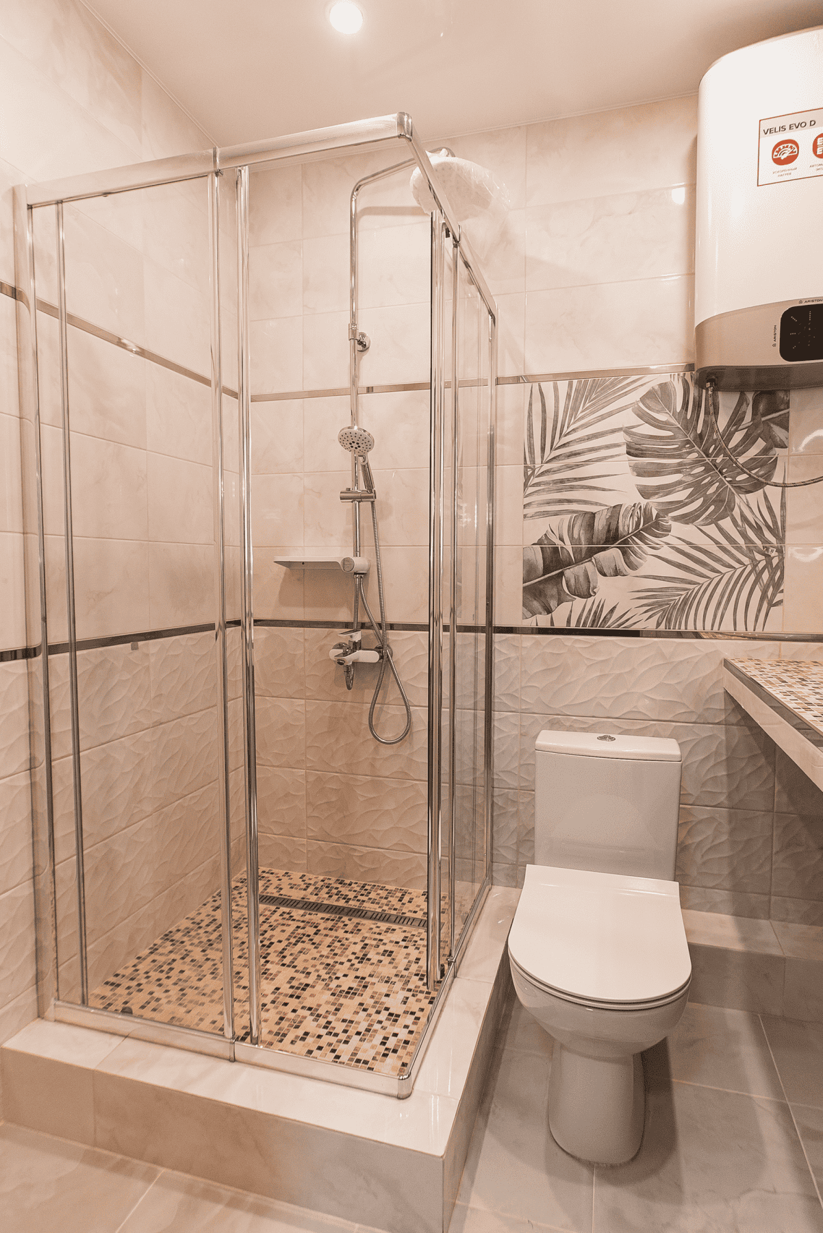 Описание: Теплый пол,поддон со стеклянной перегородкой,натяжной потолок.