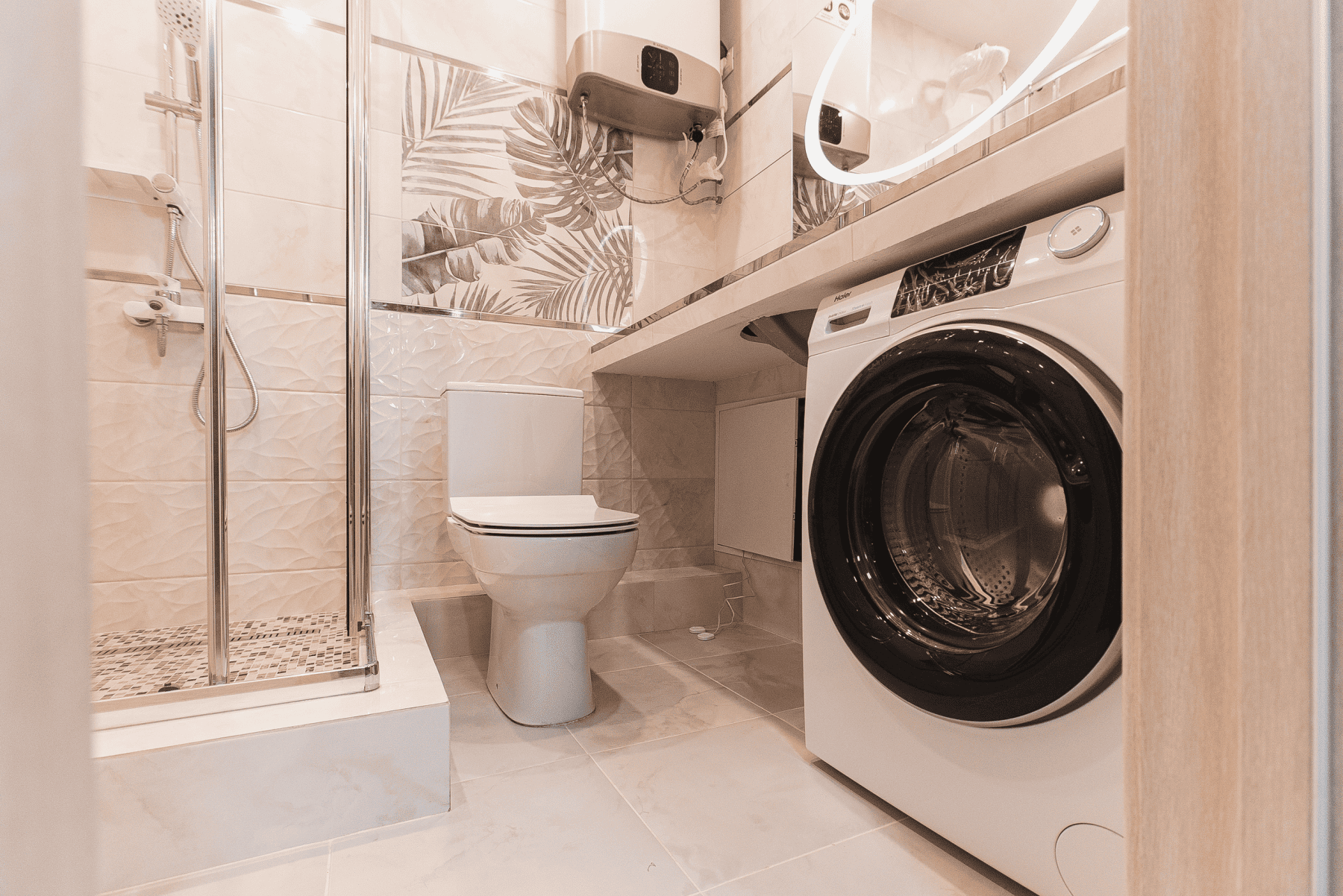 Описание: Ванная со стеклянной перегородкой, инсталляция, биде, бойлер, раковина, тумба, зеркало.