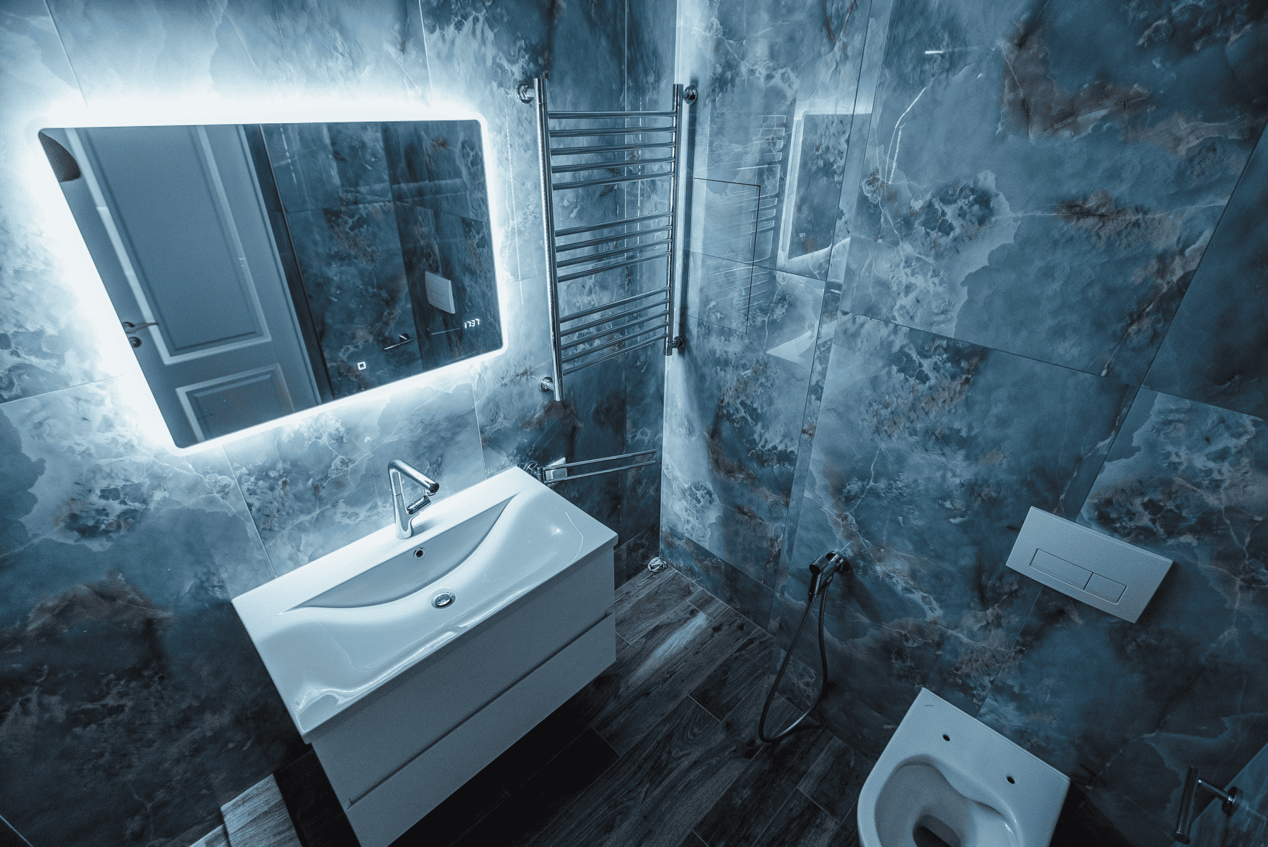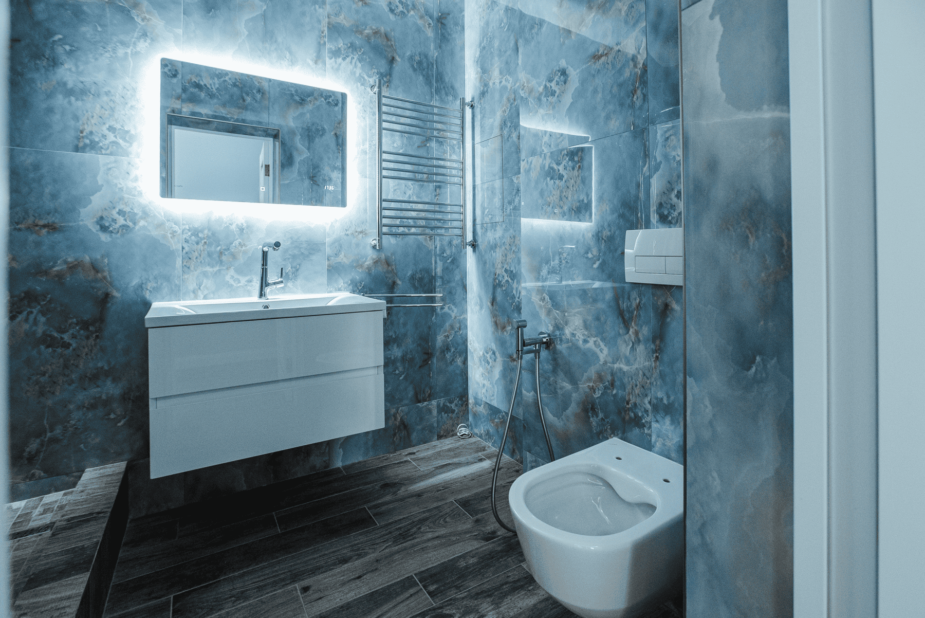 Описание: Инсталляция, биде, раковина, парящее зеркало, шкаф.